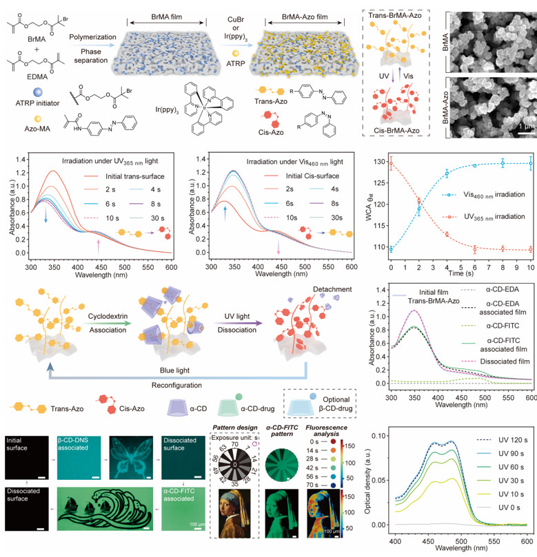 首先,甲基丙烯酸2-(2-溴异丁酰氧基)乙酯(BrMA)被用作疏水活性单体,通过光引发的相分离聚合方法在玻璃基底上一步制备具有原子转移自由基聚合(ATRP)活性的多孔超疏水聚合物薄膜。薄膜的多孔结构为超疏水/亲水性能提供必要的表面粗糙度、有效的药物负载面积、以及药物释放所需的传质通道。随后,2-(全氟辛基)乙基甲基丙烯酸酯通过ATRP反应在薄膜上聚合,构建超疏水、高疏油氟化边框。在氟化边框内部,4-(甲基丙烯酰氨基)偶氮苯(Azo-MA)分子进行聚合度可控的接枝,并与α-环糊精(α-CD)药物水溶液进行组装,在氟化边框内部形成亲水的药物负载区域。
