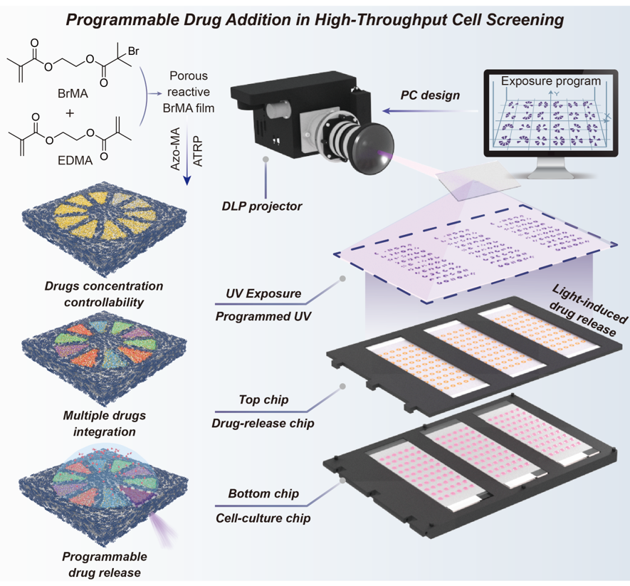 活细胞的高通量筛选对于有效药物的发现、理解细胞进程的研究、以及推进个性化药物的安全检测至关重要。目前,大多数基于细胞的高通量筛选是基于多孔板培养,并辅以复杂的移液步骤实现药物的添加。然而,这种操作步骤繁琐,特别是针对较小液滴内培养的非贴壁细胞,对培养液的频繁扰动会干扰细胞的行为,影响实验的准确性。如何实现在不同时间点向数千个液滴平行进行程序性的药物添加,并同时确保最小的机械干扰,是细胞高通量筛选领域中的一项挑战。