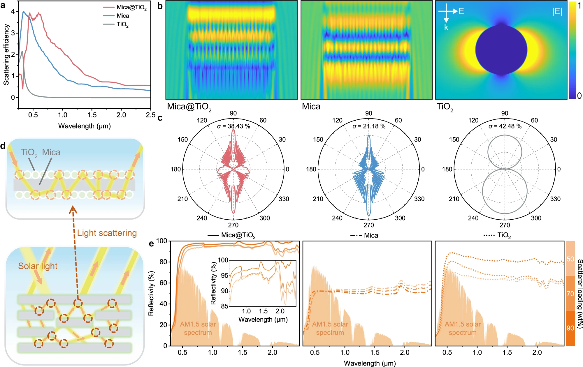 近日,成人漫画 傅强/邓华教授团队利用“溶剂交换-二次质子化”策略,构筑了一种基于芳纶纳米纤维(ANFs)树枝状胶体和云母/二氧化钛(Mica@TiO2)核壳散射体的层状PDRC薄膜(AMTA)。通过对ANFs多步质子化过程的精确调控,其呈现出高度支化的三维网络结构,可稳定负载高含量的片状Mica@TiO2核壳散射体,并快速诱导层状结构成型,赋予其超过100 MPa的力学强度。与此同时,核壳散射体在光学模拟中也呈现出更强的散射效率因子,尤其是背向散射,它连同其它折射率差异界面处的散射行为(如孔隙界面)共同促进了PDRC材料的太阳光反射率(>90%),并在实际户外制冷测试中实现日间降温3-4℃,夜晚降温6-7℃。此外,依赖于各组分本征的优异性质,该设计还集成了绝缘、紫外耐候、耐高温、耐刮擦等综合实用性能,有望进一步应用于车衣、手机、电缆热管理防护等领域,为PDRC技术在户外场景中的持久服役提供了潜在可能。该工作以“Thin lamellar films with enhanced mechanical properties for durable radiative cooling”为题发表在Nature Communications上(Nat. Commun. 2023, 14, 6129)。文章第一作者是成人漫画 硕士研究生熊联虎。该研究得到国家科学技术部(重点研发计划)的资金支持。