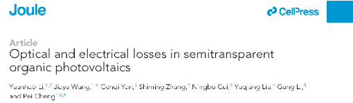 太阳能作为热门的清洁能源之一,近年来迎来巨大发展,其中有机光伏凭借重量轻、半透明、轻薄和柔性等优点成为目前热门的研究和发展领域之一。半透明有机光伏在光伏建筑一体化、农业大棚、智能窗户等多种场景中具有广泛应用,成为了有机光伏的一个重要研究方向。半透明有机光伏的可见光透过率与光电转换效率之间存在平衡关系,半透明器件的效率低于不透明器件。因此,探究由不透明到半透明过程中器件的光损失和电损失,对于提高半透明器件效率具有重要的研究意义。