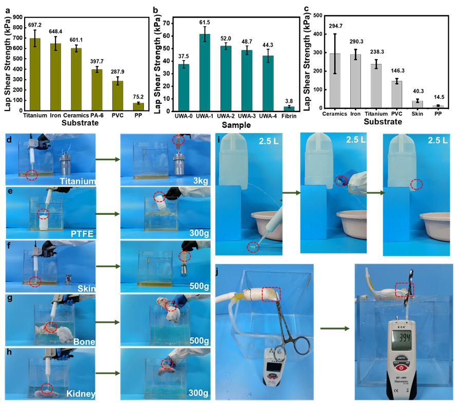 图2(a) PUWA-1对不同基材的粘接强度; (b) PUWAs对猪皮的粘接强度; (c) PUWA-1对不同基材的水下粘接强度; (d-h)PUWA-1对钛、PTFE、猪皮、骨、肾的水下粘接照片;(i) PUWA-1在水流环境中对桶破孔进行修复的照片和(j) PUWA-1对猪主动脉组织的爆破压力测试。