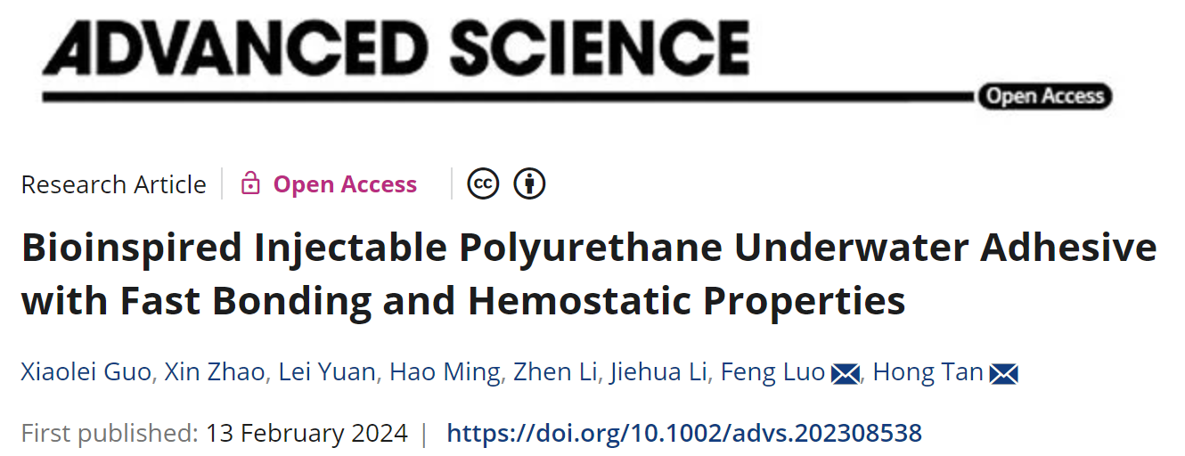 该工作以“Bioinspired Injectable Polyurethane Underwater Adhesive with Fast Bonding and Hemostatic Properties”为题发表在《Advanced Science》上,通讯作者为成人漫画 谭鸿教授和罗锋副研究员。该项工作得到国家自然科学基金重点项目(U1930204),国家自然科学基金(51873117),四川省科技计划项目(2022NSFSC0375),成人漫画 Med-X材料中心创新计划(MCMGD202304)和高分子材料工程国家重点实验室(sklpme2202-07)的支持。