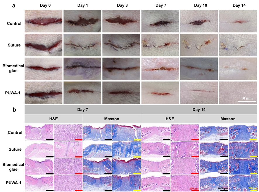 图3(a)缝合、生物医用胶、PUWA-1处理的伤口随时间变化照片;(b)愈合7天和14天后皮肤组织染色图像。