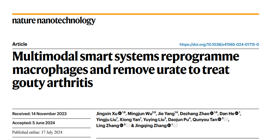 张凌研究员课题组继2023年在国际知名学术期刊《Signal Transduction and Targeted Therapy》发表类风湿关节炎靶向治疗研究成果(Metabolic reprogramming of proinflammatory macrophages by target delivered roburic acid effectively ameliorates rheumatoid arthritis symptoms.//www.nature.com/articles/s41392-023-01499-0,DOI: 10.1038/s41392-023-01499-0)以后,与重庆医科大学张景勍教授、谭群友教授团队合作,7月17日在国际著名学术期刊Nature Nanotechnology发表了题为“Multimodal smart systems reprogramme macrophages and remove urate to treat gouty arthritis”的痛风性关节炎靶向治疗研究论文。