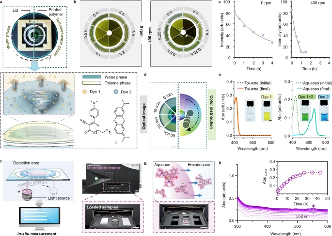 液滴微反应器的小型化和便携化保证了操作者能够通过不同的手段是对反应进行实时监测。其中一种方法是利用光学显微镜结合色度分析对有色反应进行实时监测;而在处理低浓度或液滴内没有可观察到的颜色变化的化学过程时,可以定制特别的检测板,使其能够搭载液滴微反应器,从而通过商用酶标仪对液滴内进行的萃取反应进行原位的实时监测。该印刷聚合物芯片、商业检测设备和操作软件的定制和集成为液滴内的化学反应和过程提供更方便、更精确的原位监测解决方案。