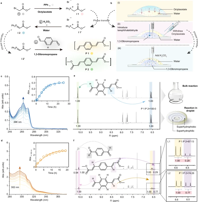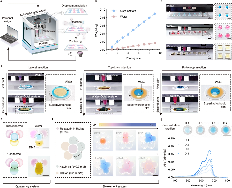 复杂有机分子的合成在功能化合物的发现和制备中起着核心作用,开发支持多步骤合成且无需手动处理中间体的系统是化工和制药行业的长期目标。目前大多数能够兼容多种液体的合成平台通常基于传统间歇式反应器的集成,而这需要大量的工程投资,并且受限于标准化软件或多功能硬件等方面的技术瓶颈,难以实现快速的个性化定制以提高集成的通量。学术界与工业界亟需一种便携式的化学合成平台来实现多相液滴中化学反应的多样化进行。