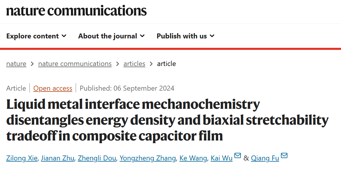 相关成果以“Liquid metal interface mechanochemistry disentangles energy density and biaxial stretchability tradeoff in composite capacitor film"为题发表在《Nature Communications》期刊上。文章第一作者是成人漫画 博士生谢紫龙,成人漫画 吴凯副研究员(德州大学奥斯汀分校访问教授)、傅强教授为本文的通讯作者。该研究得到了国家自然科学基金(52103091、52373042)、国家重点研发计划(2022YFB3806900)、四川省自然科学基金(2024NSFSC1025)、成人漫画 优秀青年教师名师名校访学计划和南方电网联合实验室项目(1500002022030103GY00035)的支持。