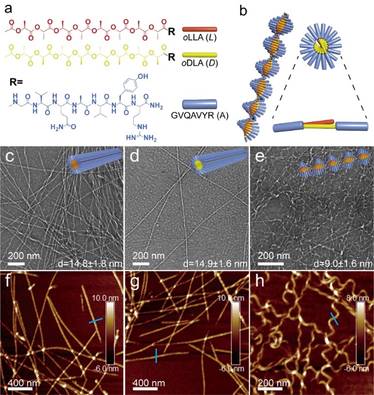 超分子交替共聚物是双组分共聚物的特殊形式,需要两种单体之间存在强烈的异源相互作用。学院苏浩特聘研究员课题组首次利用寡聚乳酸(oLA)对映异构体之间的立构复合作用(Stereocomplexation),开发了一种基于多肽-寡聚乳酸偶联物的超分子交替共聚物体系。具体来说,研究团队以oLLA和oDLA作为手性疏水尾链,并选择较弱β-sheet倾向的多肽片段制备了两种多肽-寡聚乳酸偶联物作为组装基元L-A和D-A(图1)。两种单体均能够自组装形成直纤维,其直径约14.8 nm,符合双分子层堆叠模型。而L-A/D-A共混物的组装形貌转变为螺旋纤维,其直径约9 nm,与交错双分子层模型高度吻合。研究团队通过圆二色(CD)、UV-vis、红外等光谱手段,以及临界胶束浓度(CMC)的测定系统表征了共混物的分子排列方式和组装能力等(图2)。手性疏水尾链之间的立构复合作用能显著增强共混物的组装能力,驱动两种单体交替排列,最终形成超分子交替共聚物。研究团队进一步探究了组装路径对自组装行为的影响(图3)。在四种不同组装路径下,共混物均最终形成螺旋纤维,且它们的CD光谱几乎完全一致,表明超分子交替共聚物即为热力学平衡态的组装产物。最后,研究团队通过改变多肽链段的β-sheet倾向,探究了手性疏水尾链之间的立构复合相互作用与多肽链段间氢键相互作用之间的竞争与协同机制。在弱氢键体系中,立构复合相互作用促进两种单体形成异源二聚体,进一步驱动两种单体交替排列形成螺旋纳米纤维。当多肽链段之间的氢键相互作用增强,共组装主要驱动力逐渐转变为氢键相互作用,两种单体随机排列,最终形成无规共聚物。该工作利用立构复合相互作用和氢键相互作用的竞争和协同成功制备了热力学稳定的超分子交替共聚物,为超分子交替共聚物的制备和超分子共聚物微观结构的控制提供了新方法和新策略。