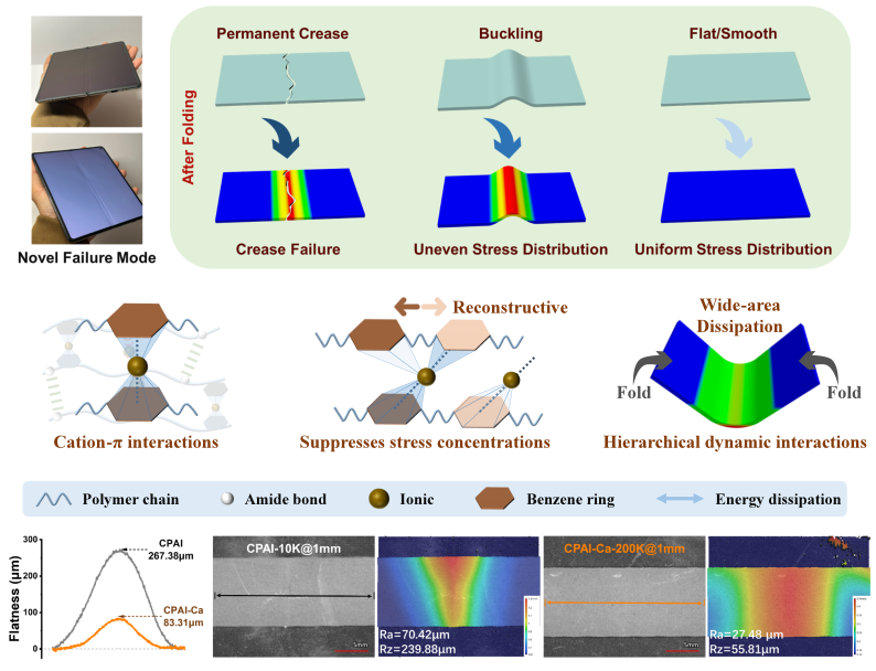 与此同时,面对一个更难以解决的新型弯折失效模式——折叠区域因残余应力集中而引发的三维“拱起”现象。团队提出“分级动态非共价交联”新策略:在无色聚酰胺-酰亚胺(CPAI)基体中同步引入氢键、Ca⟡⁺配位及阳离子-π三种动态作用,形成可逆能量顺序耗散网络。该设计选用Ca2+作为配位中心,在CPAI中构建了一个层次化的动态网络。其中,氢键作为初级单元实现快速应力响应;Ca2+-酰胺配位键作为中级单元,通过其1.98-6.61 Å的可逆滑移空间提供显著的应力缓冲;而Ca2+与芳香环之间形成的阳离子-π相互作用则作为远程单元,在6.71-9.82 Å的尺度上建立广泛的应力缓冲区,构建“滑移-缓冲-再锁定”的连续耗散,实现应力的跨尺度均匀分布。(Advanced Materials2025, e15442)