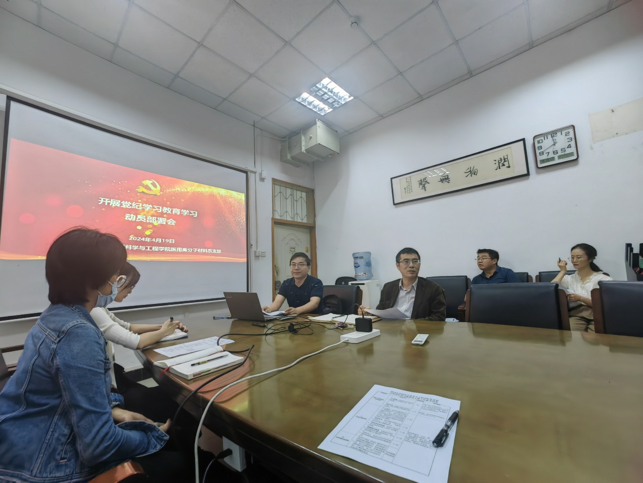为深入领会习近平总书记关于党纪学习教育的重要讲话和重要指示批示精神,贯彻落实中央党的建设工作领导小组会议和《中共中央办公厅关于在全党开展党纪学习教育的通知》精神、学院医用高分子材料系党支部于2024年4月19日上午在学院主楼205会议室召开党纪学习教育动员部署会,并开展了主题为“严守党规党纪,强化自我约束”的党纪学习研讨活动。会议由医用高分子材料系支部书记赵伟锋主持,支部全体党员参加,学院党委委员、院长杨伟出席活动。