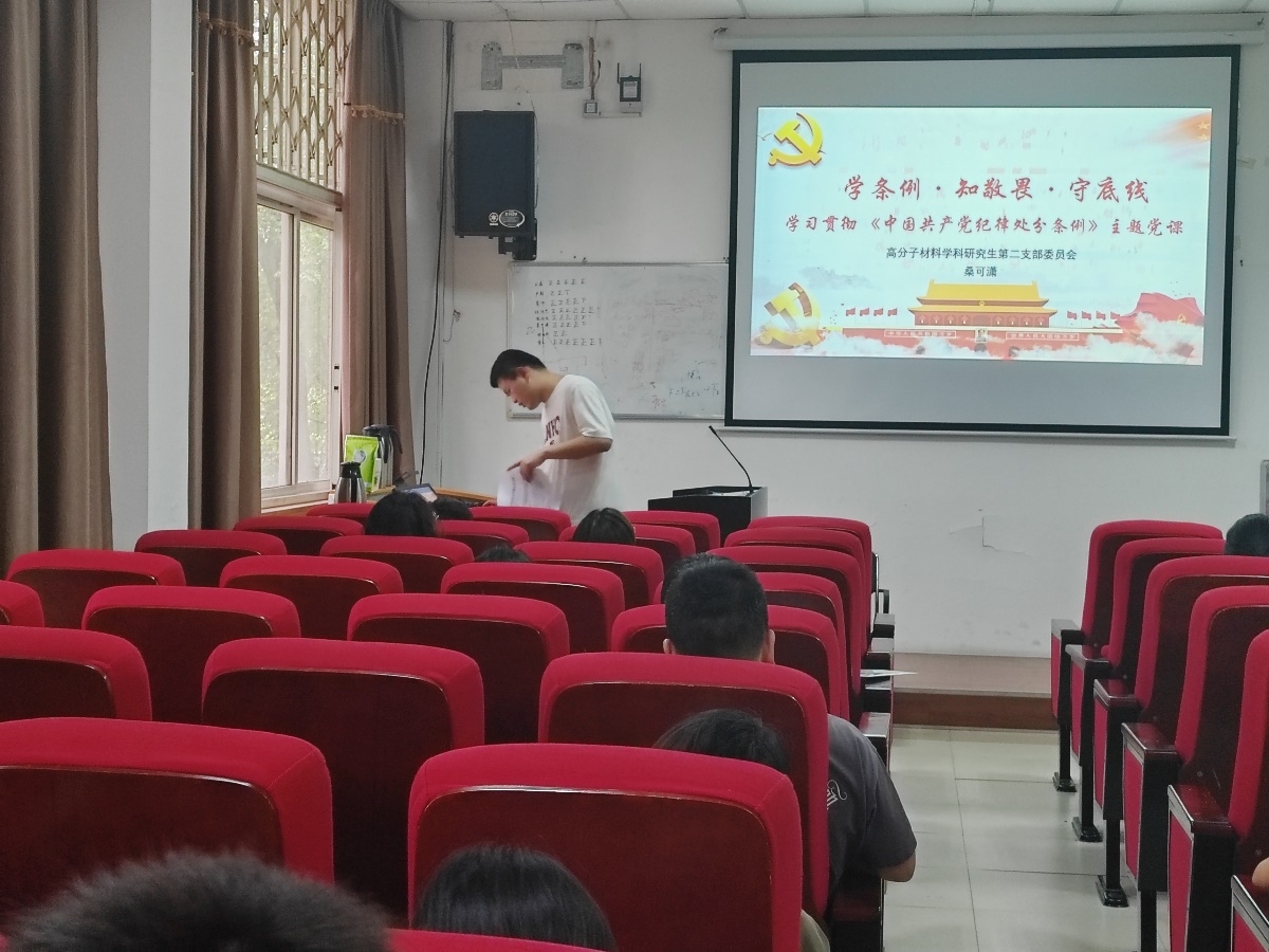 2024年4月26日下午,学院材料学硕士研究生第二党支部在学院附楼207会议室开展“学条例·知敬畏·守底线”主题党课宣讲活动。学习《中国共产党纪律处分条例》了解其重要意义,贯彻习近平总书记关于党纪学习教育的重要指示批示精神。