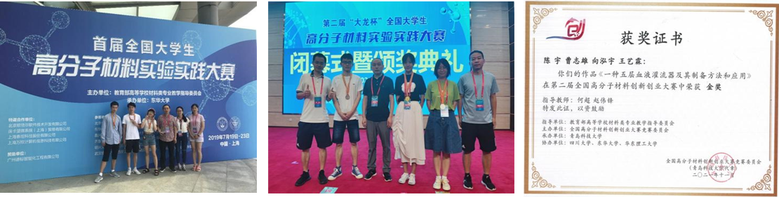 全国高分子“实验实践”大赛获一等奖、全国高分子“创新创业”大赛获金奖