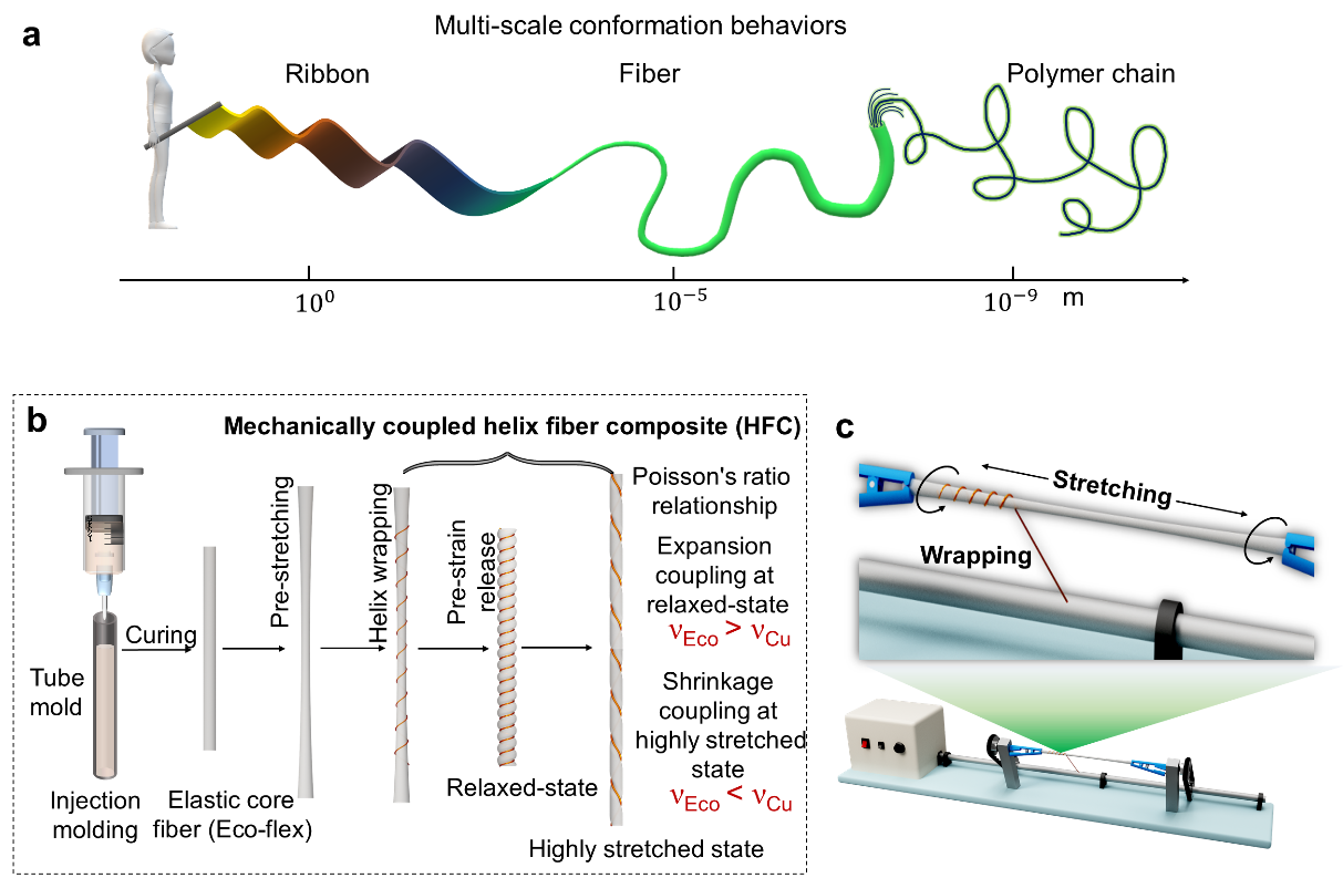丝线缠绕是一种非常古老的材料加工策略,即便是科技发达的今天,我们依然喜欢借助这一简单方式将不可拉伸或者非弹性功能材料甚至器件缠绕到弹性体芯材上,从而获得本体不可拉伸材料的高度可拉伸或弹性特性。然而,时至今日,这一古老智慧背后的科学认识仍旧模糊。众所周知,高分子材料的机械性能从根本上依赖其化学结构与分子链的构象行为。这在聚合物链分子构象水平上已经得到充分认识,但在宏观材料水平上,构象的意义和价值...